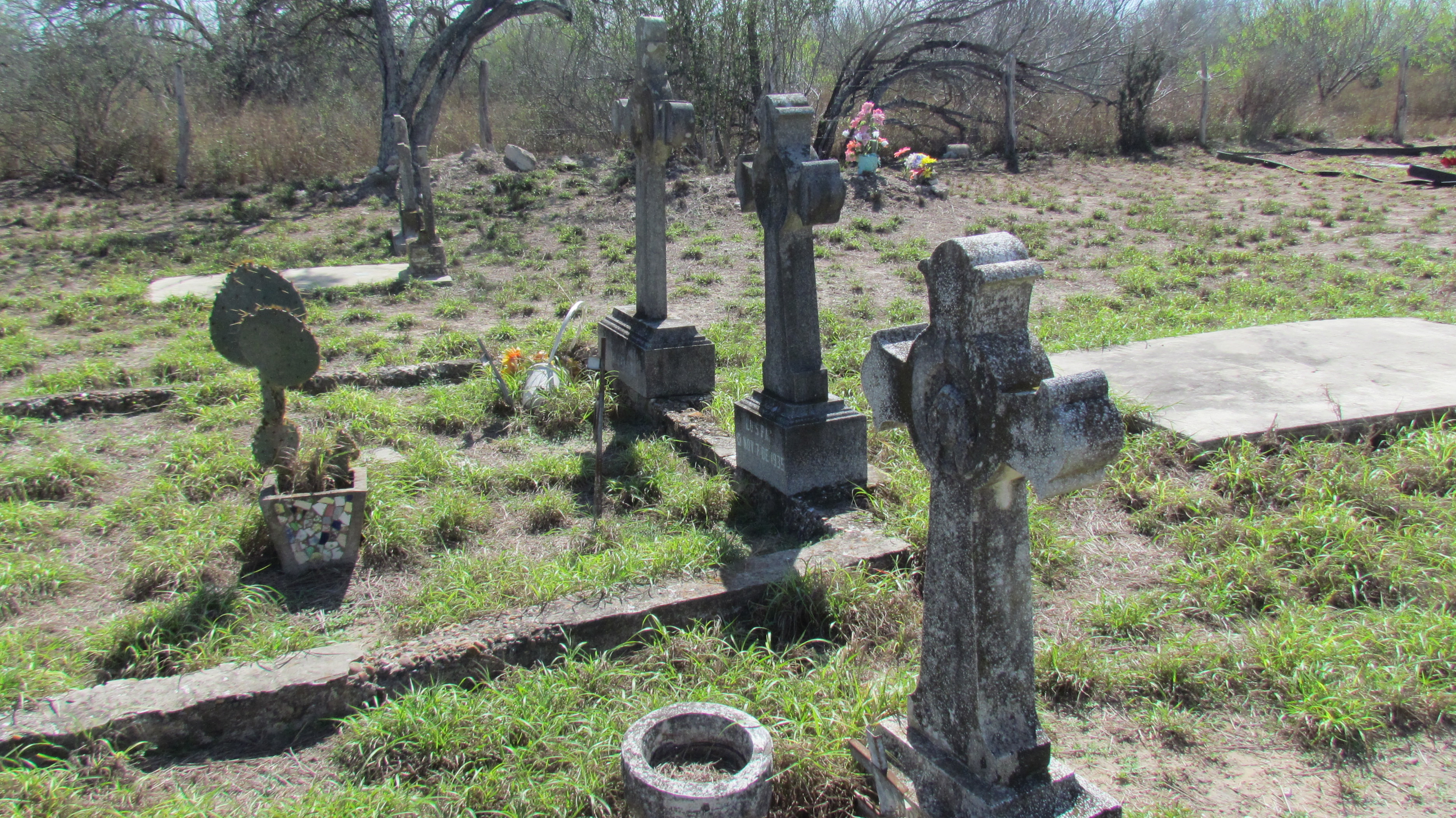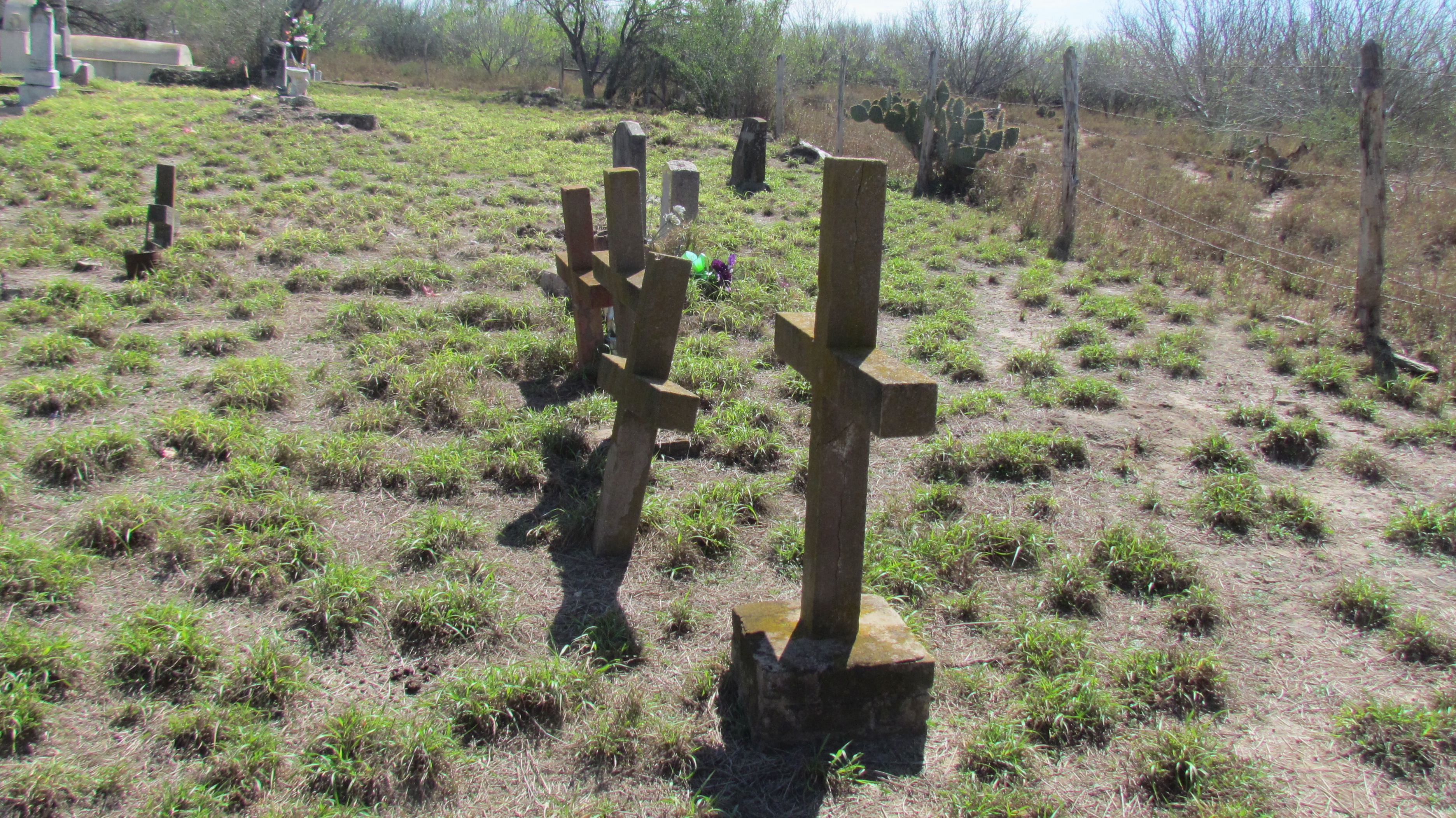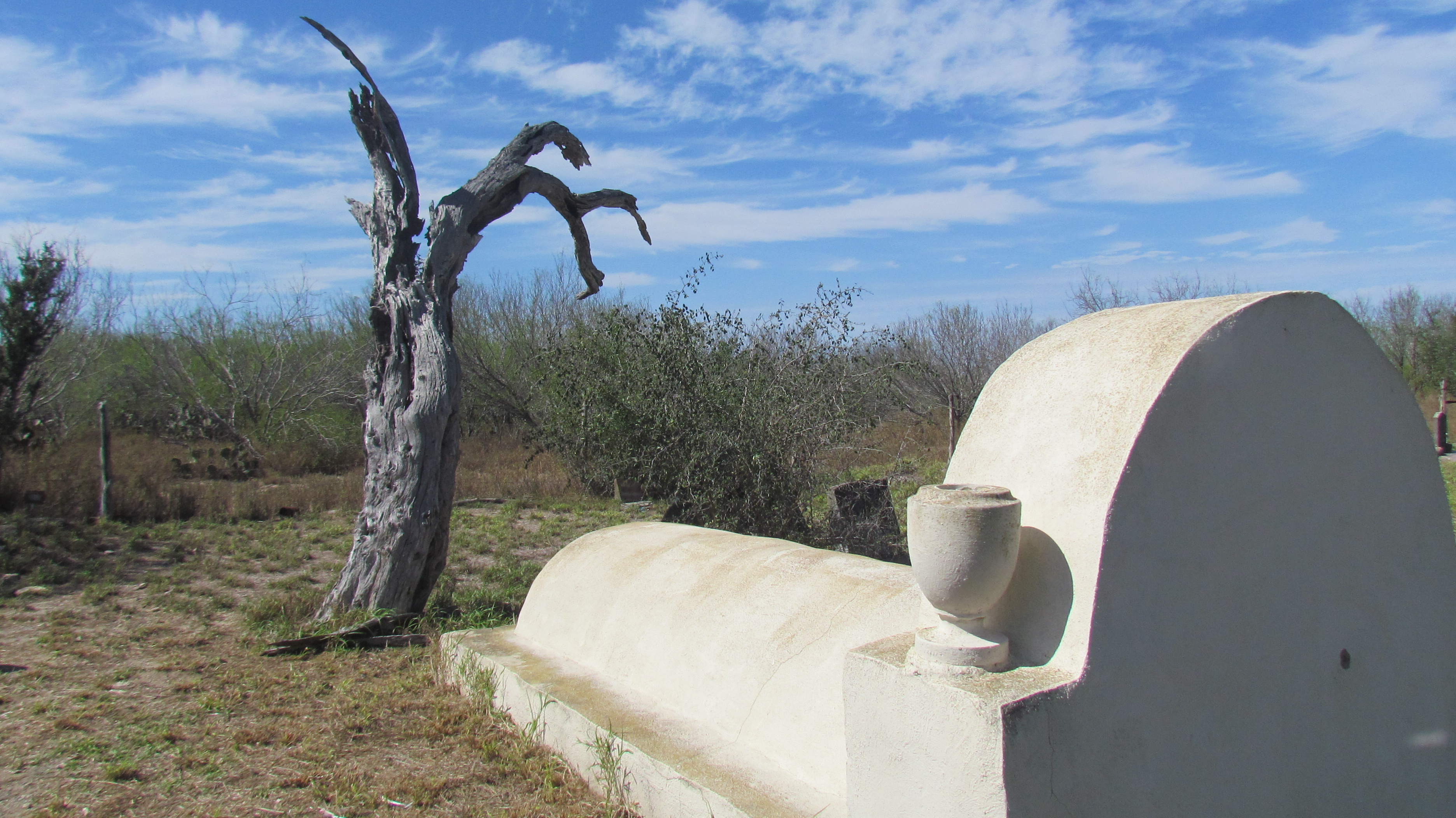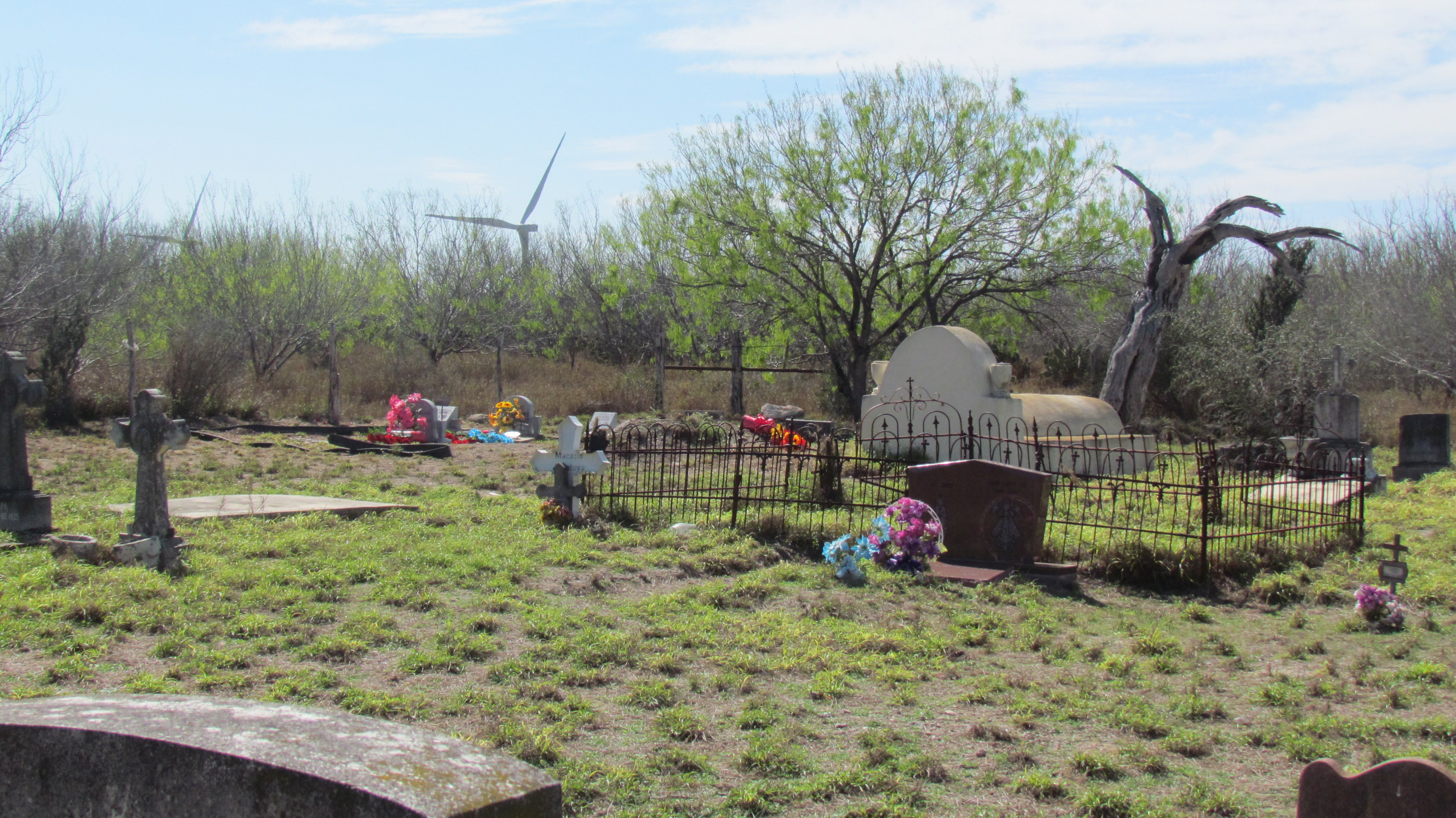 On a recent outing, I drove through Mirando City and spent some time in the Los Ojuelos cemetery. I marveled at the beautiful, stark simplicity of some of the old memorials and crypts, and I considered just beyond the barbed wire enclosure the juxtaposition of the massive white windpower papalotes that dot the landscape.