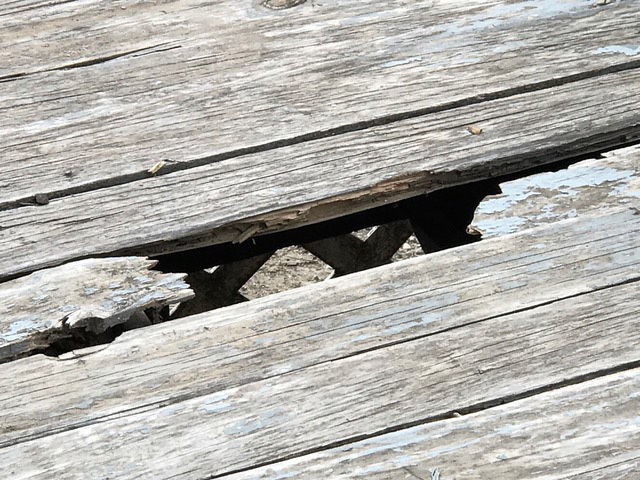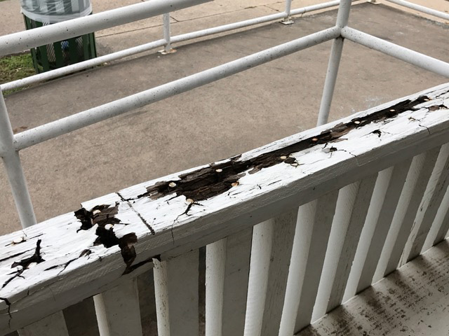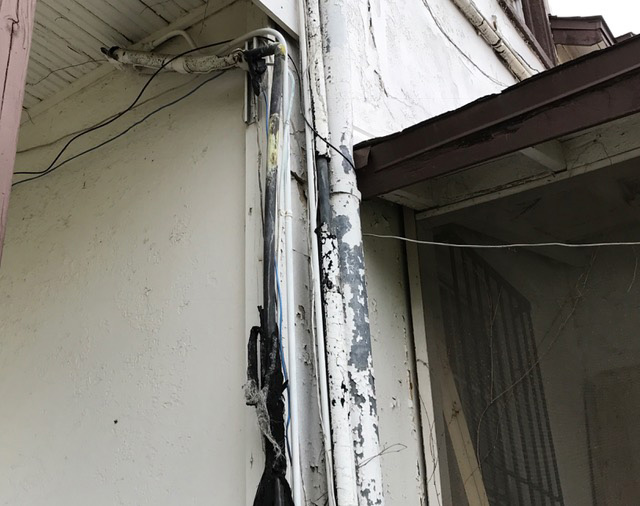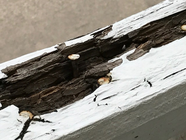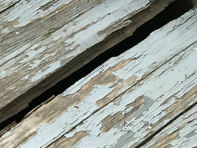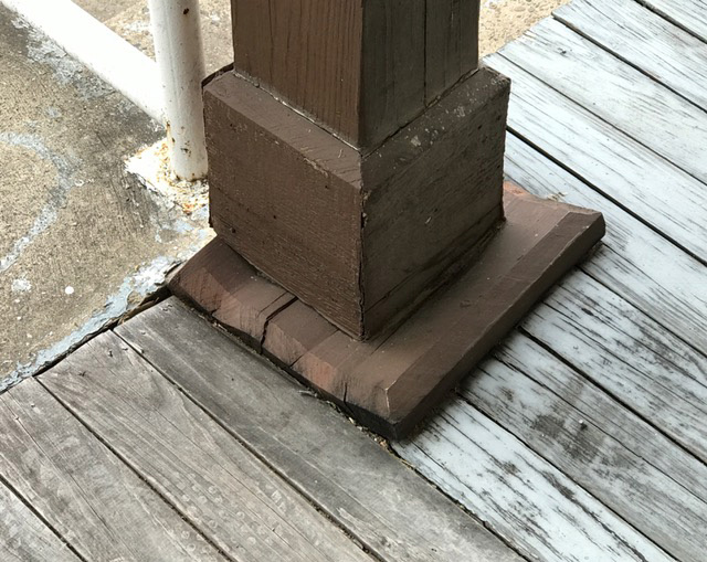 The historic structure’s porch is today a dangerous proposition of rotten tongue-in-groove planking, rotten railings, and swollen wood on which roof supports rest — all which invite matters of liability.