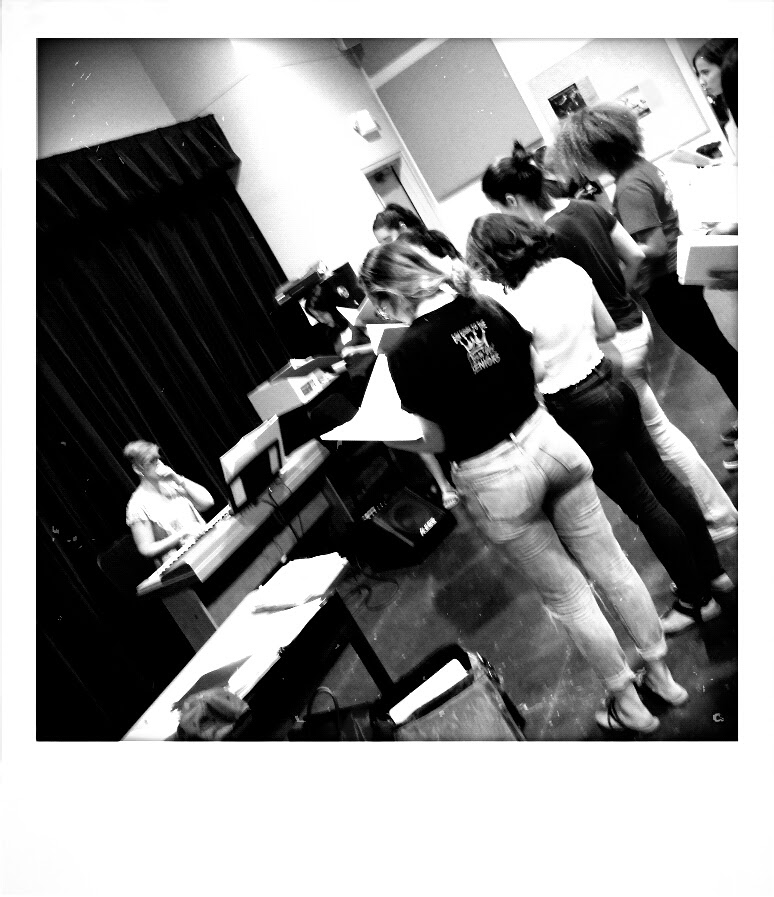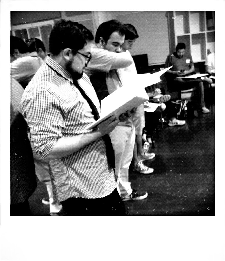 I’m rushing into the dance studio inside the Visual and Performing Arts at LCC, walking in on four men singing one of the pieces from the musical – a warm up piece. They wrap up shortly after I set up my laptop and snap some photos. Seconds later, a new combination is up – three women, one little boy, five men.
