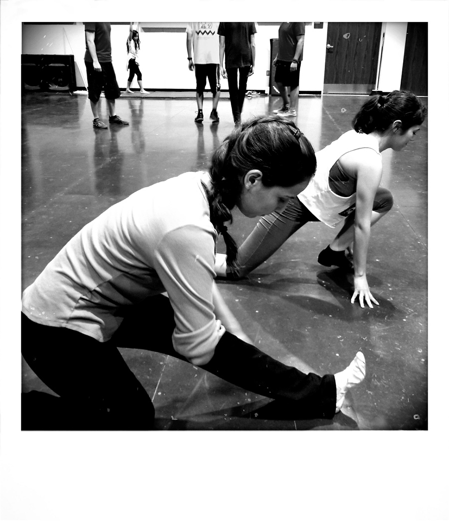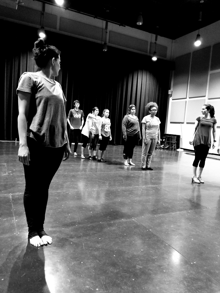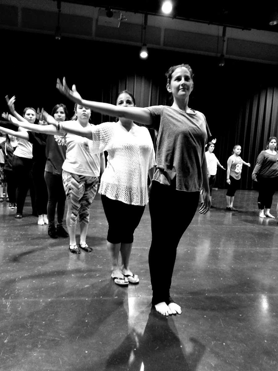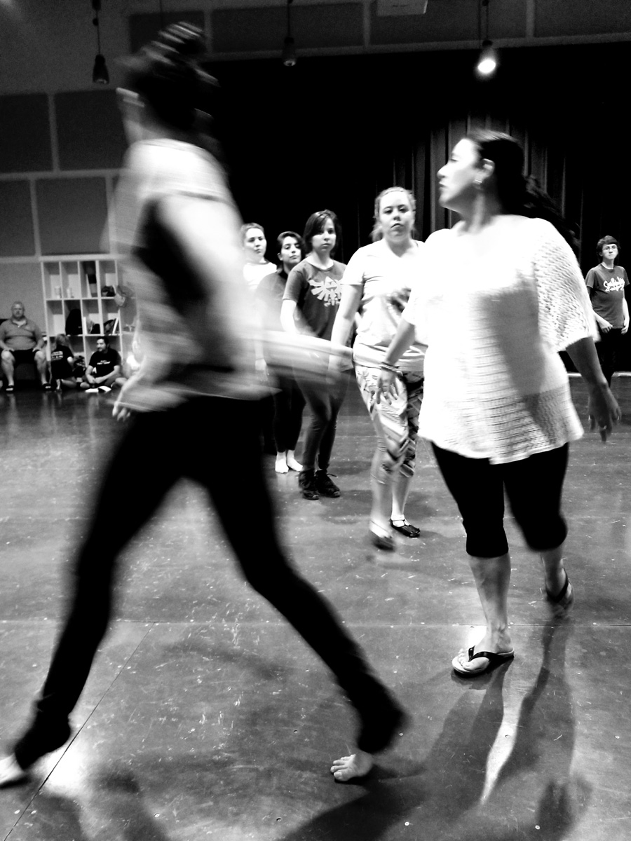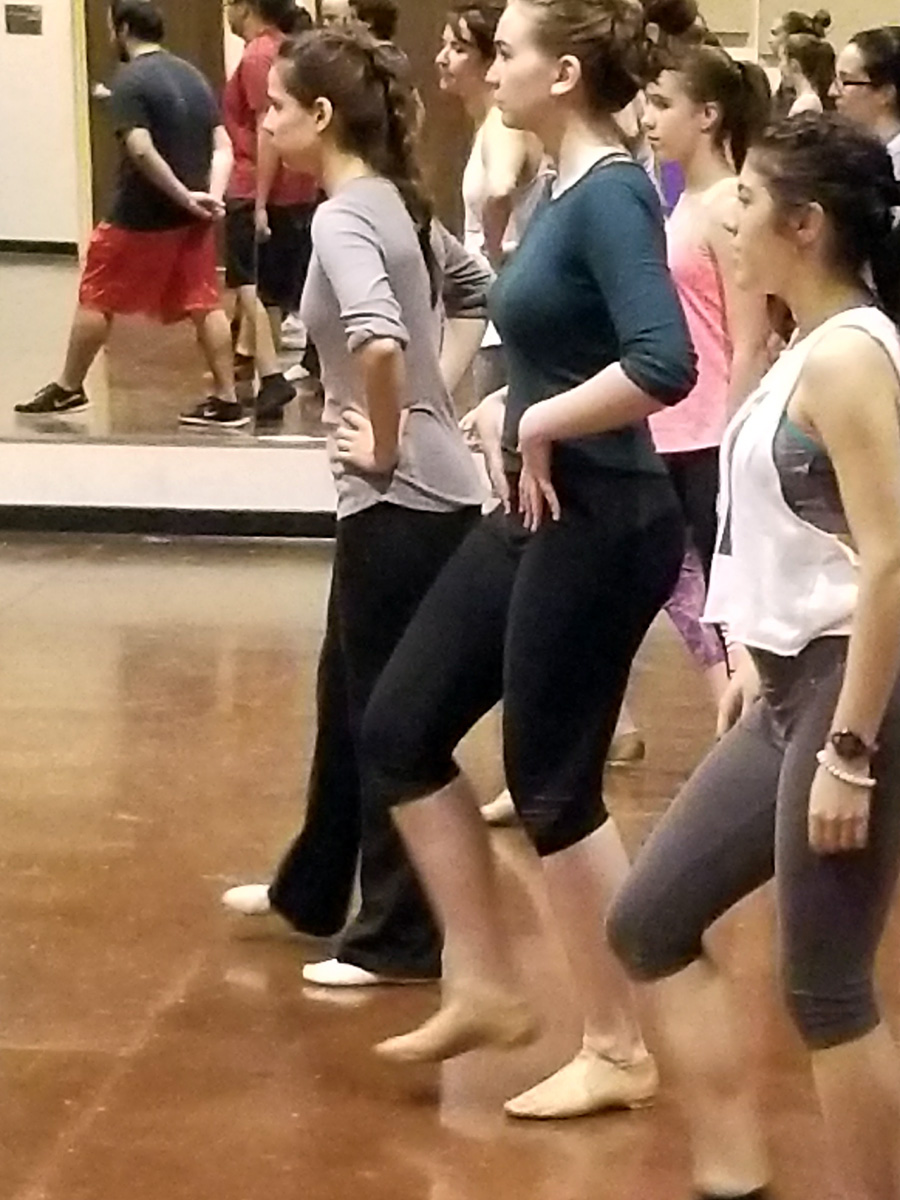 She lines cast members loosely into two rows in no apparent order. She gives them a series of moves, combinations, spins, and steps. She shows them slowly, clearly outlining each motion and movement of her body. After a few repetitions, they follow.