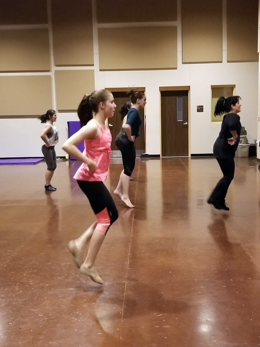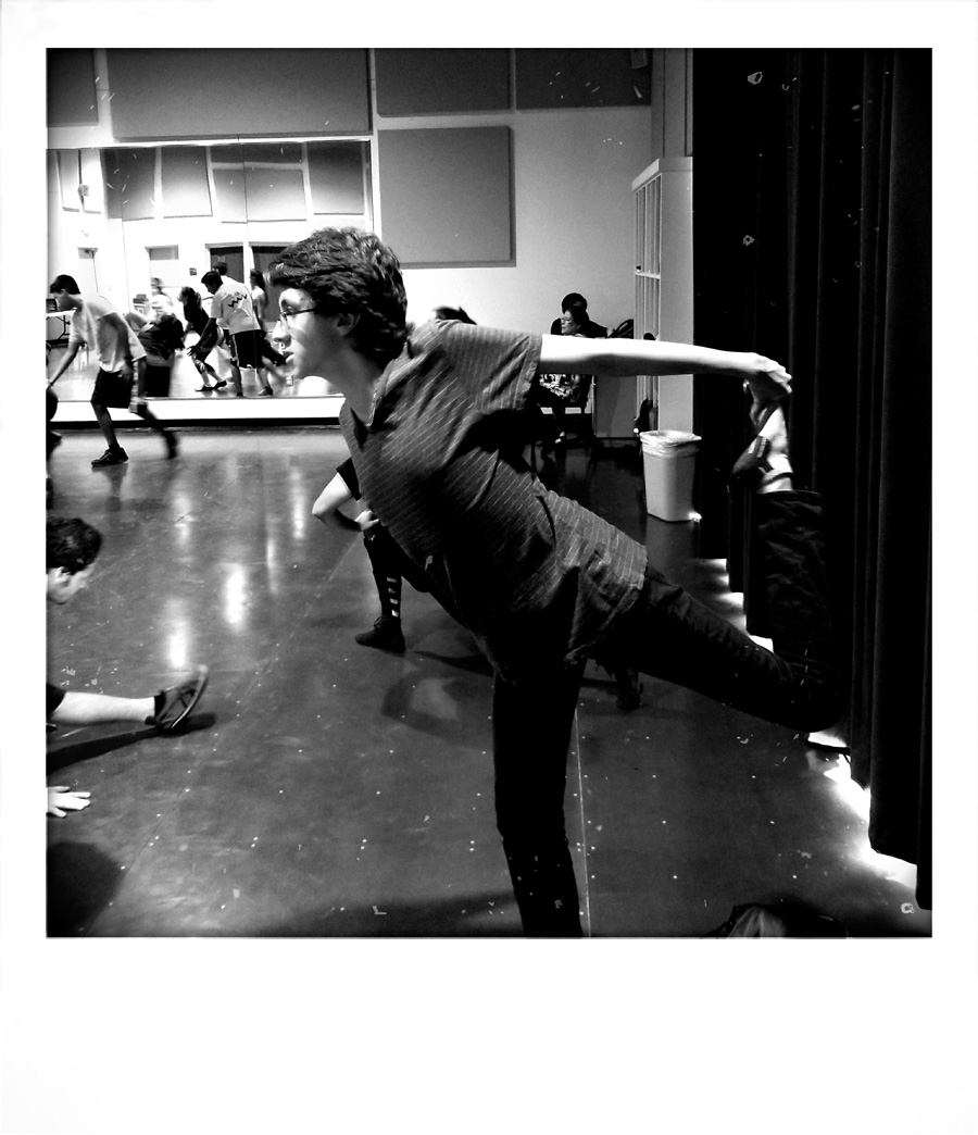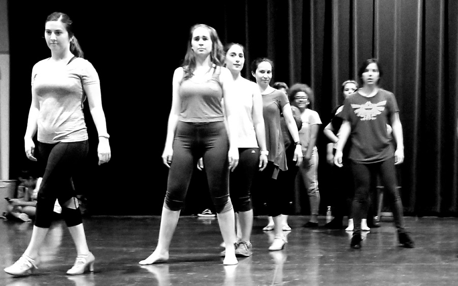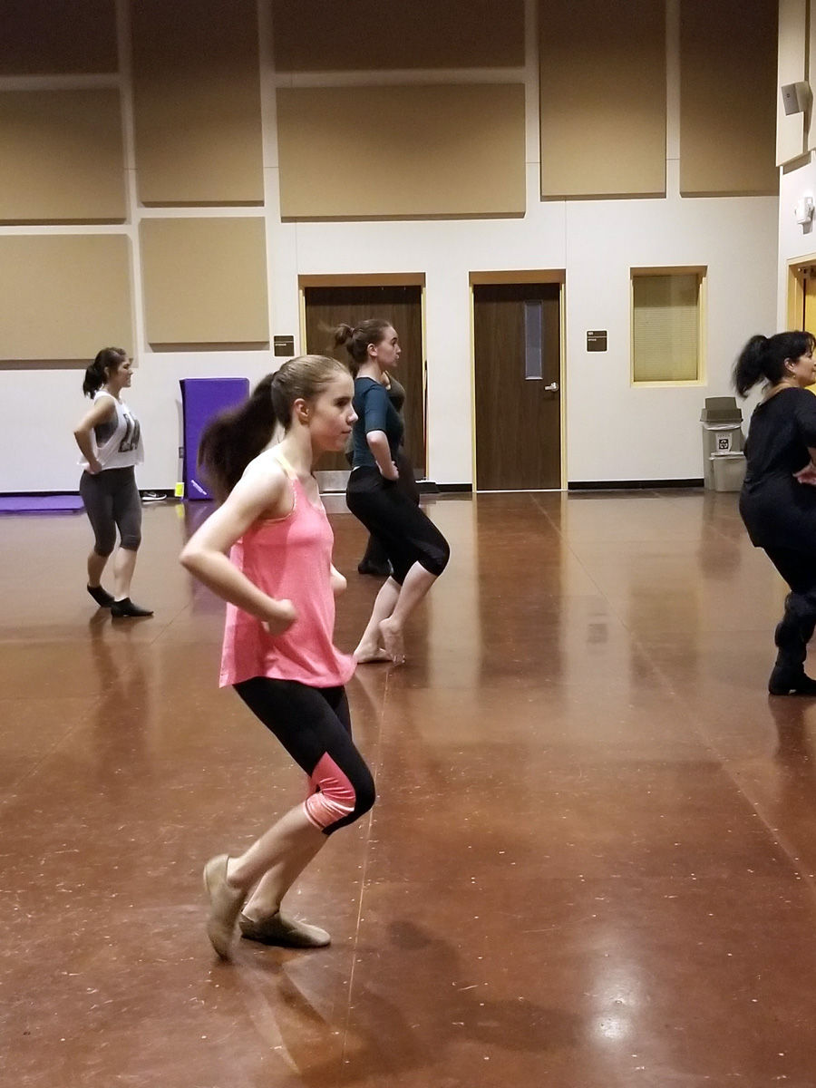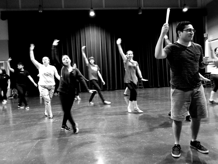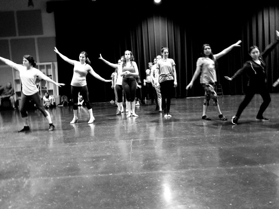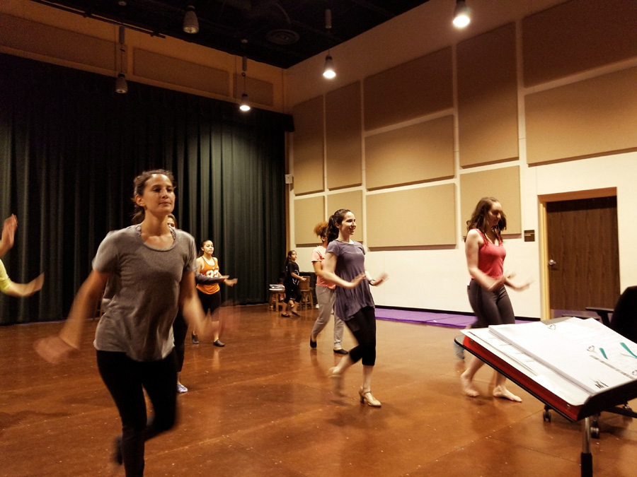 She lines cast members loosely into two rows in no apparent order. She gives them a series of moves, combinations, spins, and steps. She shows them slowly, clearly outlining each motion and movement of her body. After a few repetitions, they follow.