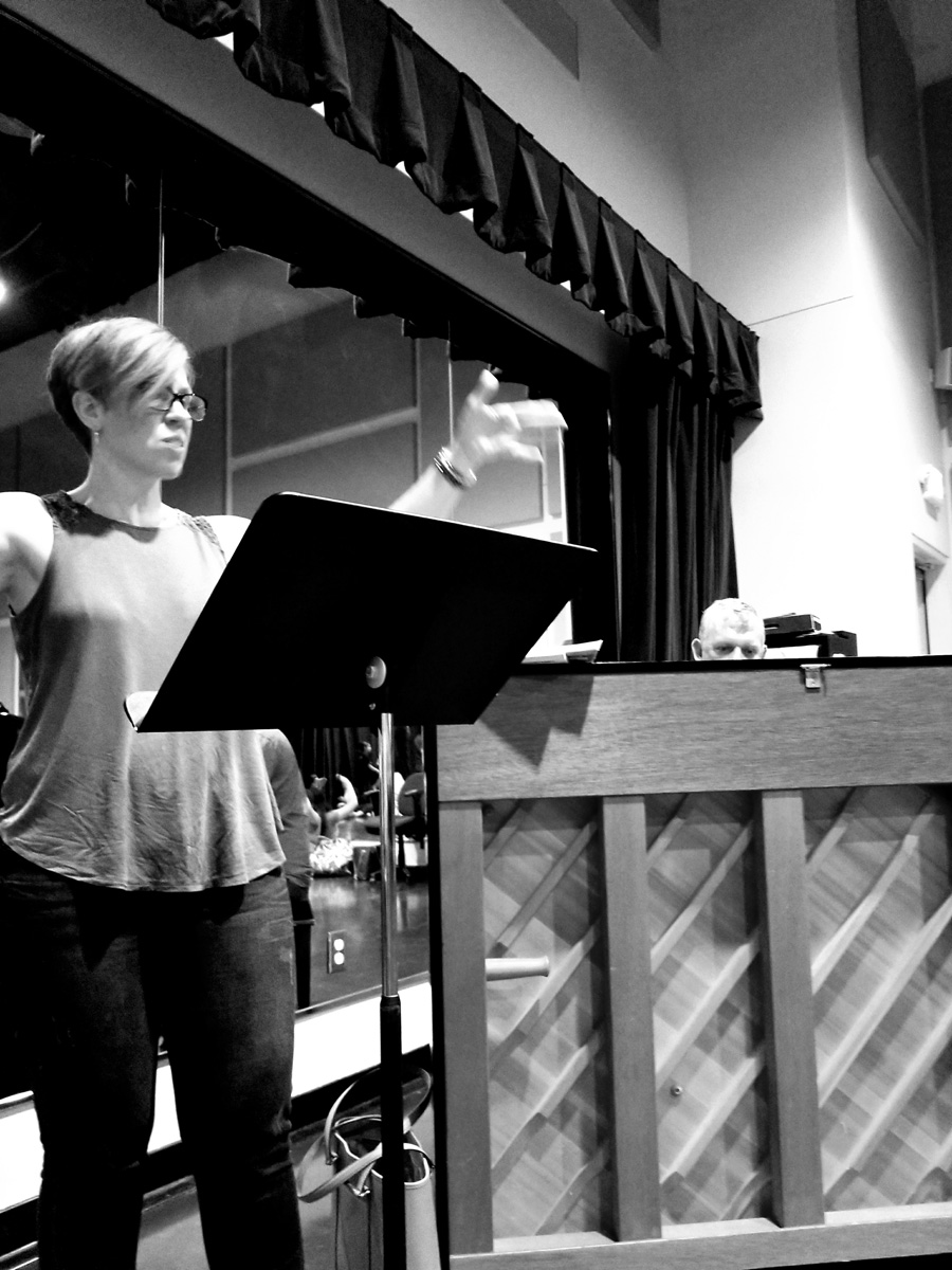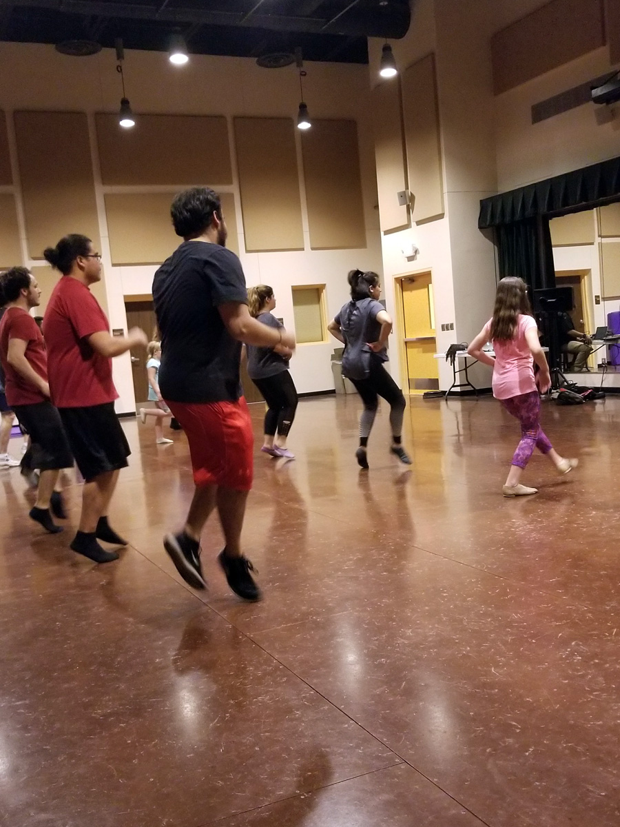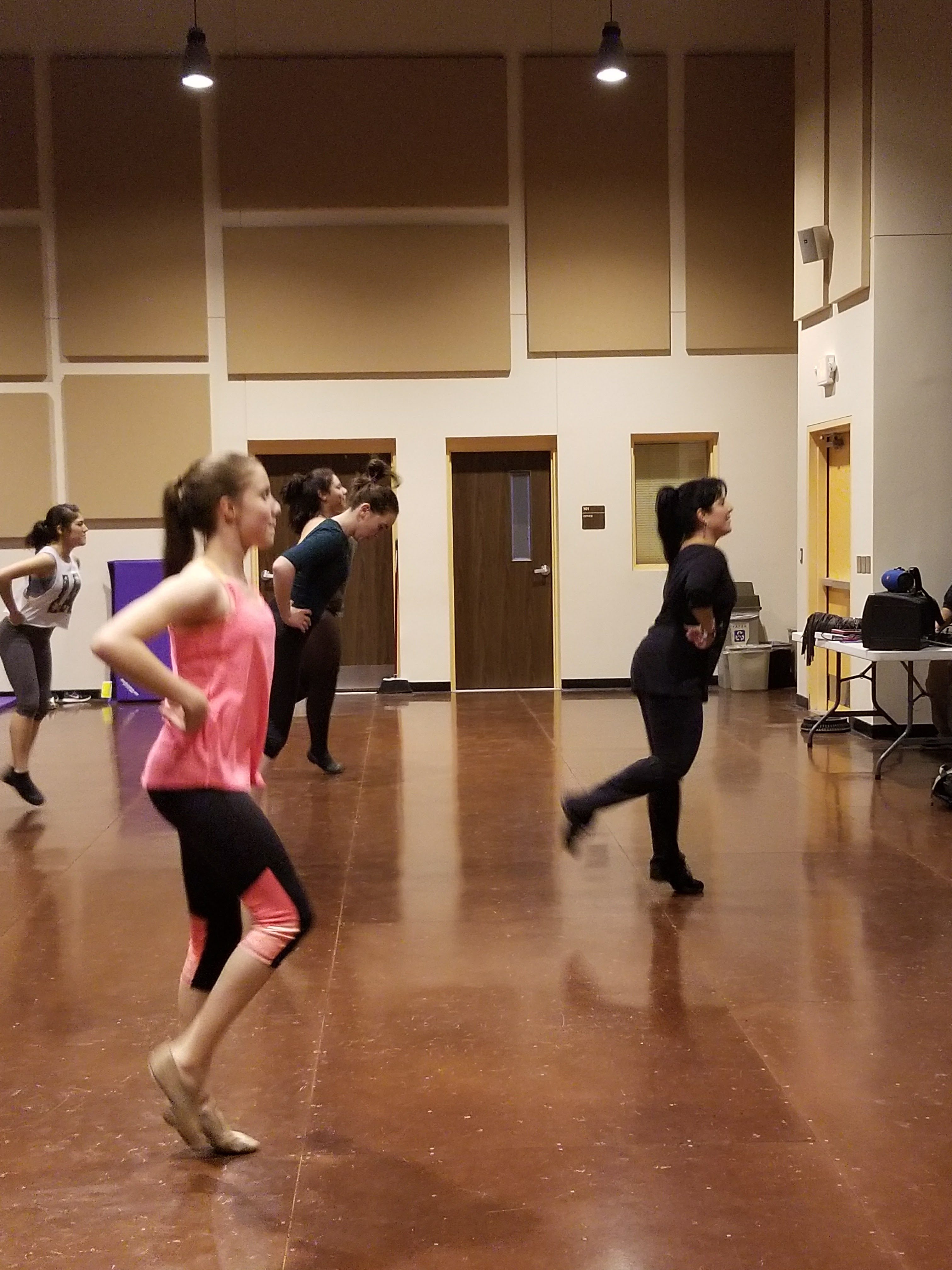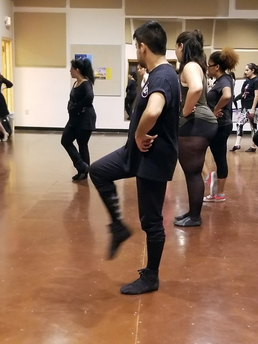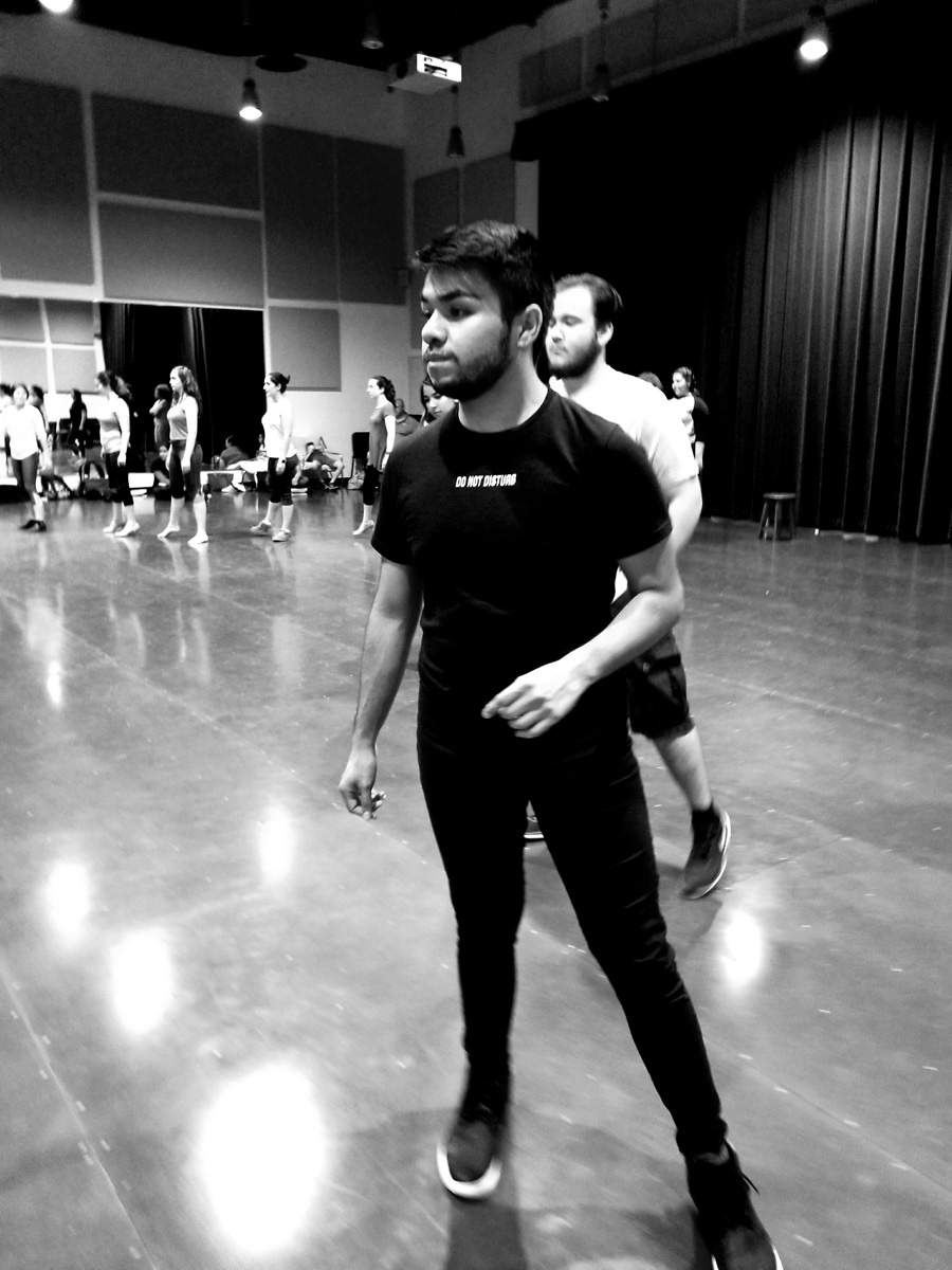 She lines cast members loosely into two rows in no apparent order. She gives them a series of moves, combinations, spins, and steps. She shows them slowly, clearly outlining each motion and movement of her body. After a few repetitions, they follow.