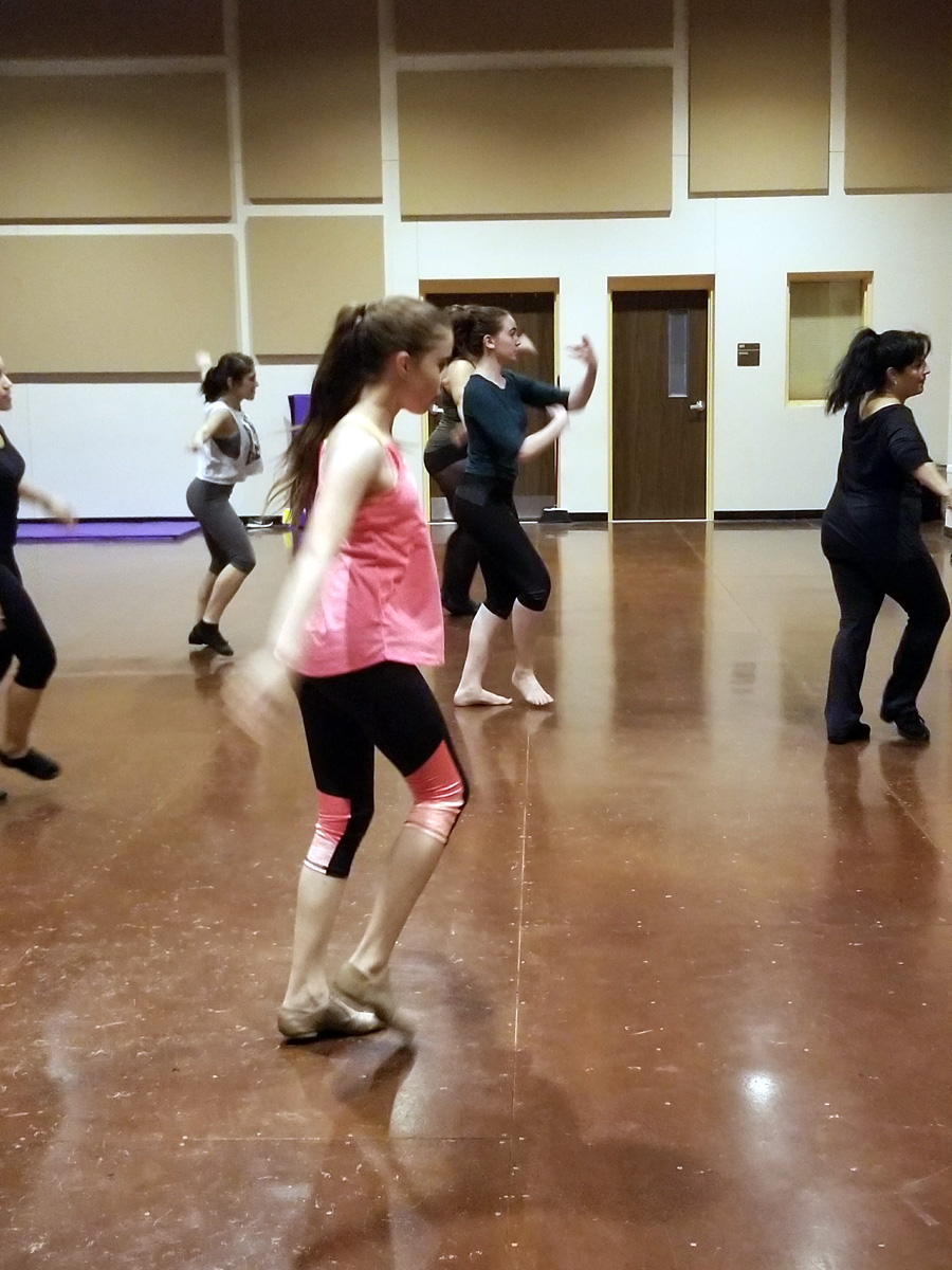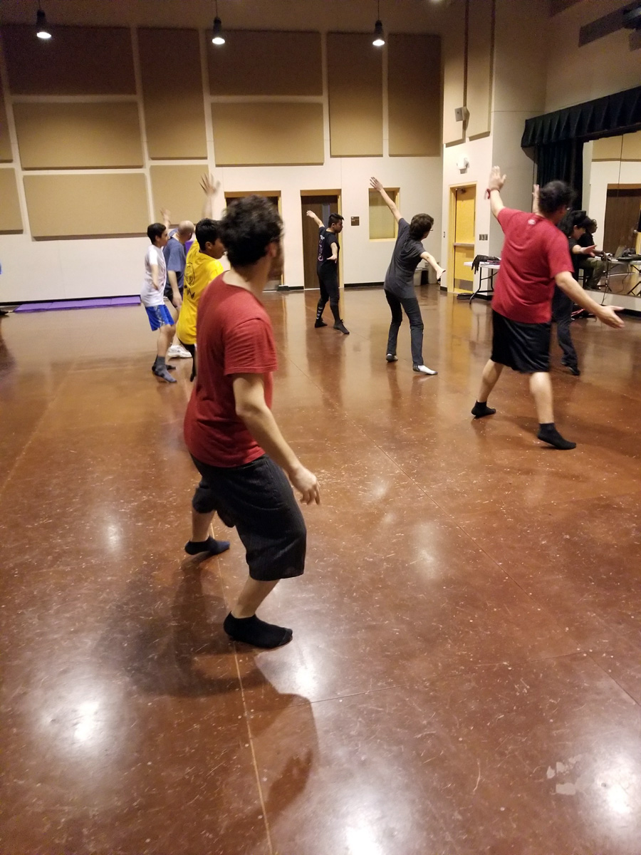 The entire cast is present again, and they are continuing to learn the dance moves they learned two nights ago. Choreorapher Greco is reviewing the moves from the same song. This time, the tempo is much slower, so that the dancers lock onto the beat and tighten up their moves. The blocking of the song, in which characters shift to various parts of the stage, is tightening up.