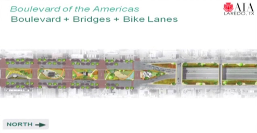 AIA-Laredo, comprised of local architectural firms, organized a series of three public design workshops or in July of 2015 for public input into the purpose, use, and features of each of the four blocks. That input included leaving open all the east to west streets that define the area and that provide vital connectors from the Azteca neighborhood and the Heights into downtown and IH-35 North, as well as connectors to U.S. Hwy. 59, Texas State Hwy. 359, and U.S. Hwy. 83.