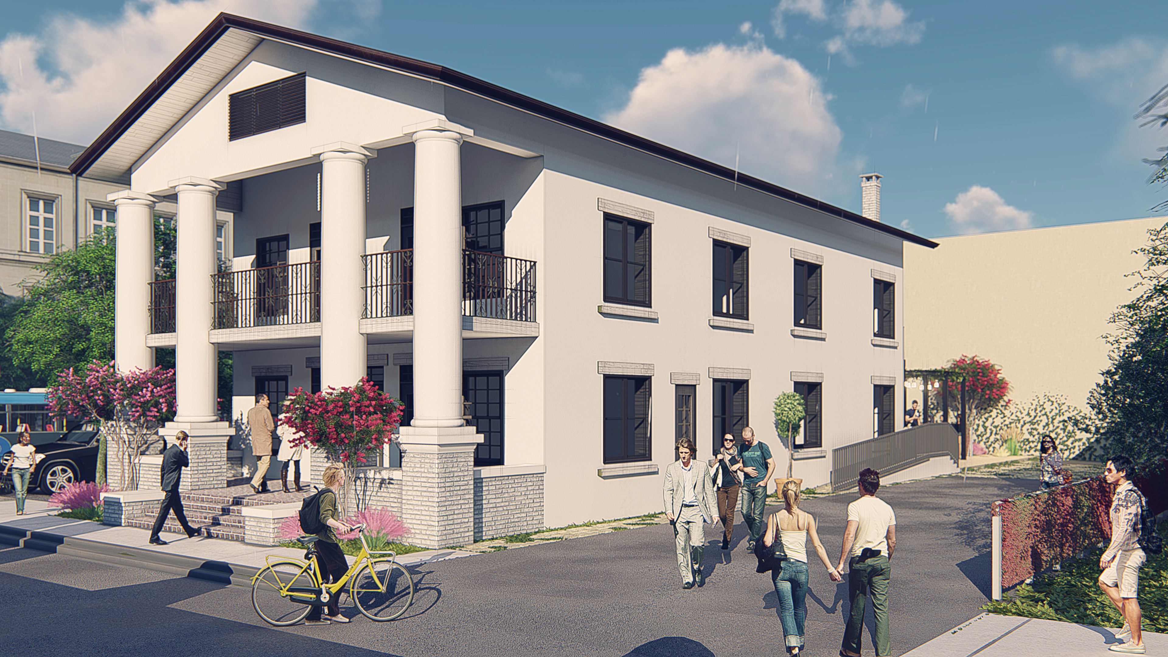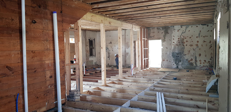 The hotel annex, once divided into apartments, has been re-roofed with standing seam metal. Its interior has been gutted and its load-bearing walls reinforced. The wooden floor upstairs will be reconstructed with added support. Its four-pane windows have been replicated in their original design.