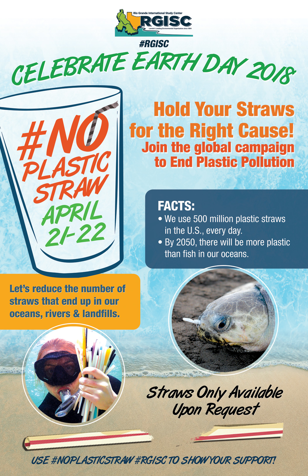 “Something so simple as giving up your plastic straw can help clean up our waterways and oceans and protect wildlife. I ask the community to participate in the #NoPlasticStraw pledge this weekend, April 21 and 22, and show support for our environment,” said Mayor Pete Saenz. “I thank the Rio Grande International Study Center, the Laredo Chamber of Commerce, and our local businesses for participating in this world-wide effort to limit our carbon footprint and make our natural world safer, more beautiful and, most importantly, more livable for current and future generations,” he said.