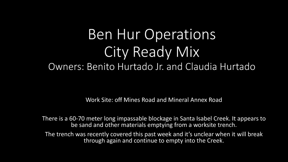 - That the concrete plant owner be required to remediate the blockage and re-open the natural flow of Santa Isabel Creek.