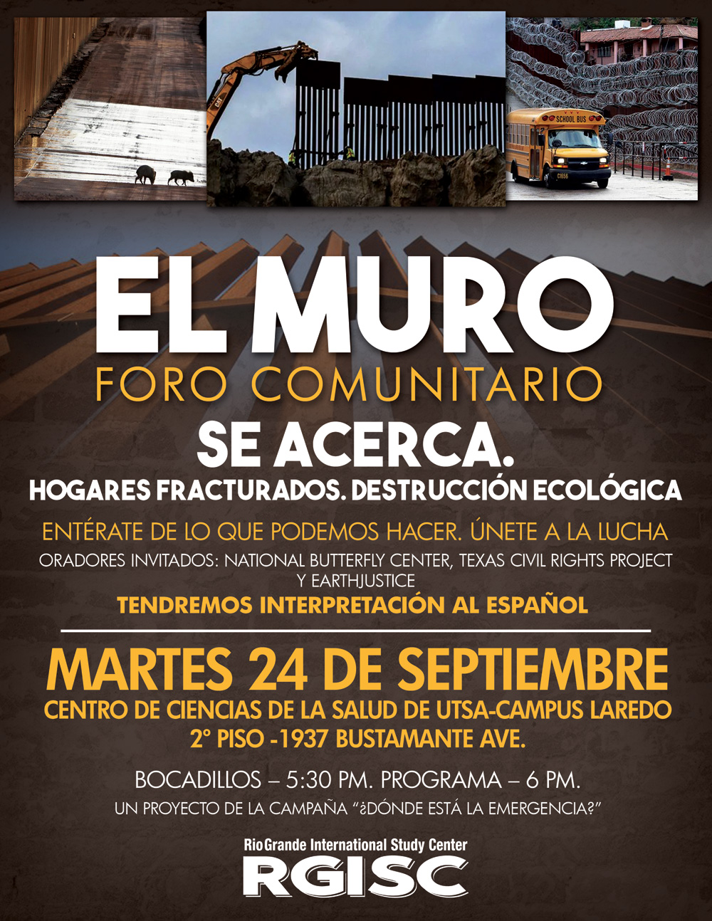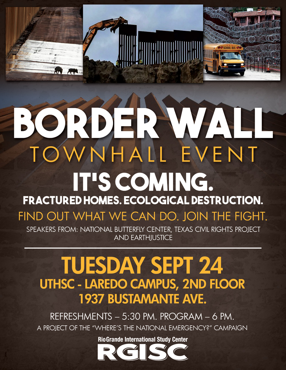 The coalition of Laredoans who have formed “Where’s the National Emergency?” is hosting a town hall meeting on Tuesday, September 24, to address environmental, civil rights, land litigation, and cultural/historic impacts of the border wall.