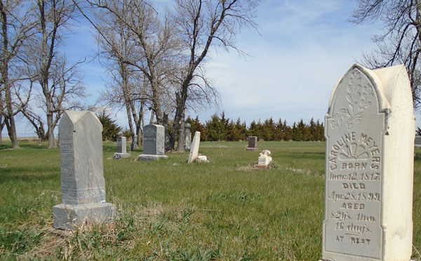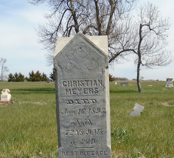 I backtracked 1¾ miles south and turned east on 24, a gravel county road. At the first intersection just a mile off 37, I found Rose Hill Cemetery, my original destination. Here lie the remains of Christian Meyers, my great-great grandpa Daniel Meyer’s half-brother, and his wife Caroline. They immigrated from Germany in 1858, but their only child was born and died during the voyage to America and was buried at sea. Of all the descendants on my dad’s side of the family, Christian and Caroline ventured the farthest west — over 200 miles from where Daniel settled in northwest Iowa. Now, their headstones face the plains as if remaining in Spink County wasn’t sufficiently west.