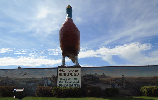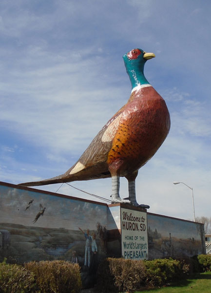 Around 11:00, I crossed the sedate James River, climbed the hill into Huron, and pulled into the empty dirt parking lot near the gates to Memorial Field Stadium. While y’all claim that everything’s bigger in Texas, I defy you to outdo Huron’s most prominent landmark, which stands across the street from the stadium: “The World’s Largest Pheasant.” Of course, the fact that the ring-neck pheasant was introduced from China and is a non-native species (or in the conservative vernacular, un-American) probably explains Texans’ lack of interest in erecting a larger one. And while the pheasant is a favorite of SoDak hunters, it doesn’t entirely explain how this reliably red state could choose zhì-jī as their state bird.