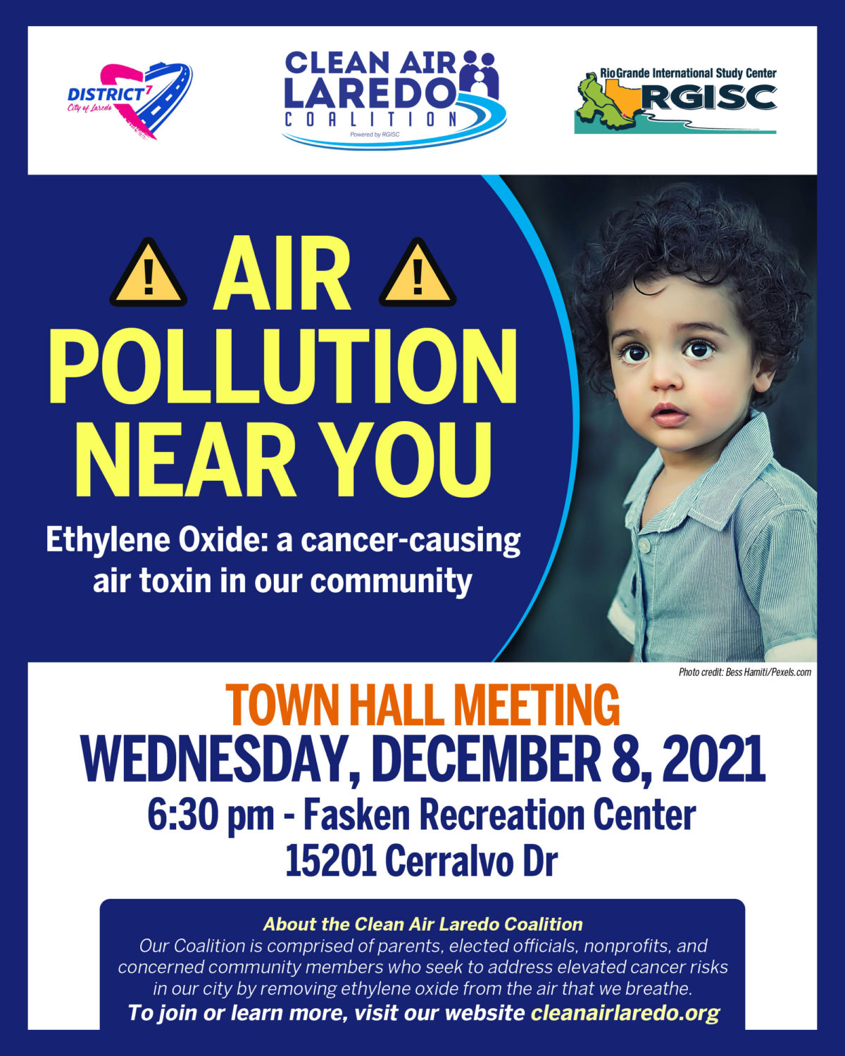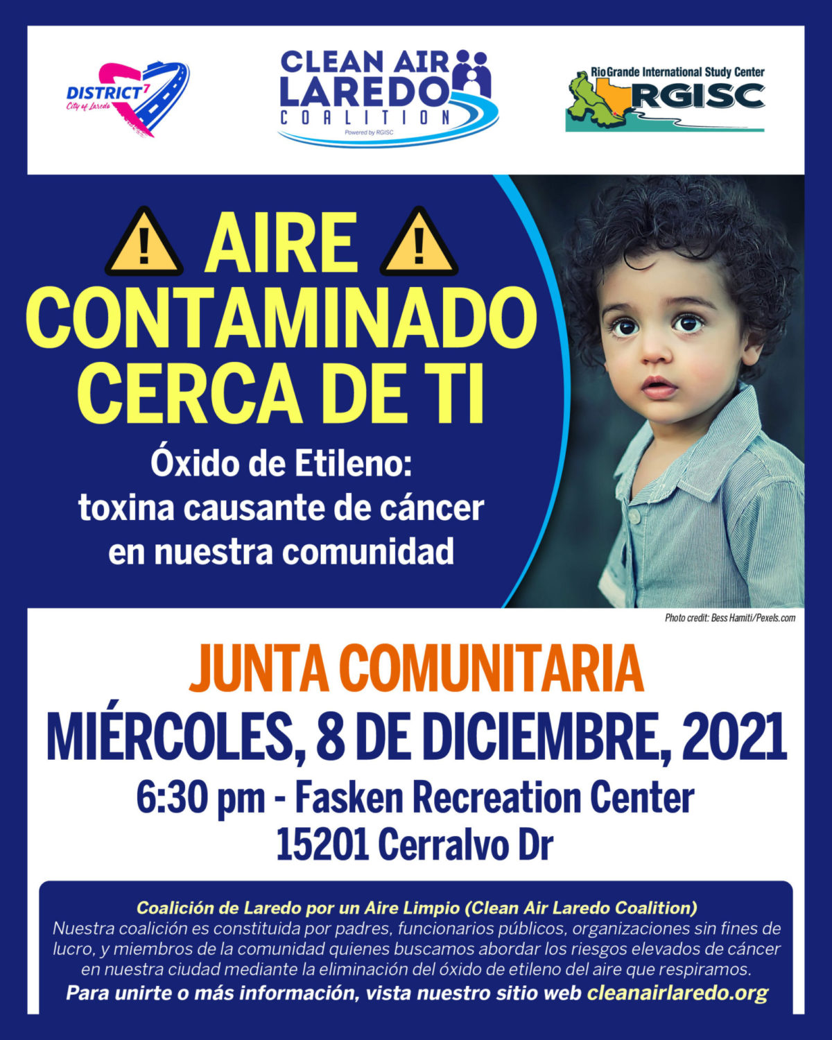 The public meeting, which is organized by the Laredo Clean Air Coalition with District 7 Council member Vanessa Perez and the Rio Grande International Study Center, is set for Wednesday, December 8, at 6:30 p.m. at the Fasken Community Center at 15201 Cerralavo Dr.